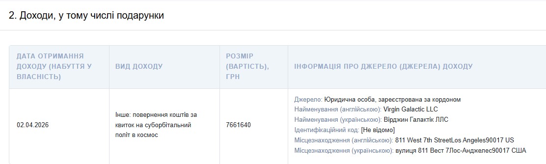 Згідно з даними декларації за 2026 рік, Борис Філатов повернув кошти за анульований квиток. Сума виплати склала 7 мільйонів 661 тисячу гривень.