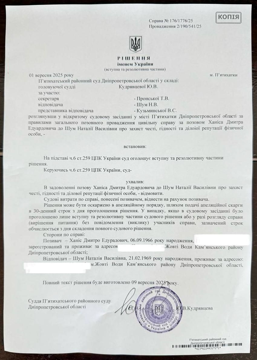 На Дніпропетровщині міський голова Жовтих Вод Дмитро Ханіс позивався до депутата Кам'янської районної ради Наталії Шум через публікацію про заздалегідь вириті могли. Проте суд відмовив задовольнити позов, передає "Відомо" з посиланням на zhovtivody.city.