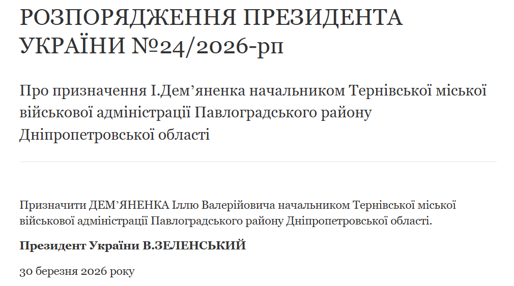 Згідно з розпорядженням Президента України №24/2026-рп, начальником Тернівської міської військової адміністрації Павлоградського району Дніпропетровської області призначено Іллю Валерійовича Дем’яненка. Документ підписаний Президентом Володимиром Зеленським 30 березня 2026 року.