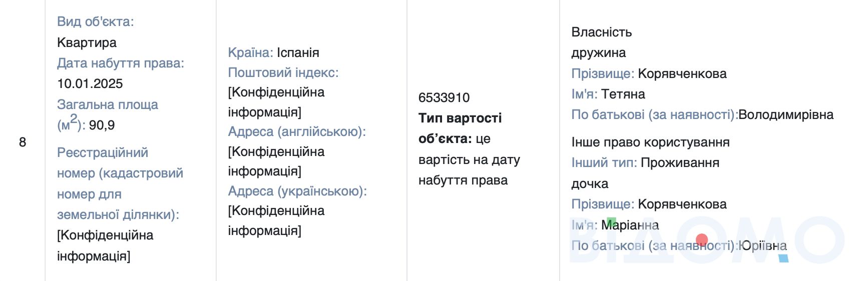 А от дружину Юрія Корявченкова можна "привітати", адже у 2025 році вона стала щасливою володаркою квартири в Іспанії площею 90,9 квадратних метри, яку Тетяна придбала, згідно з декларацією нардепа, за 6 533 910 гривень.