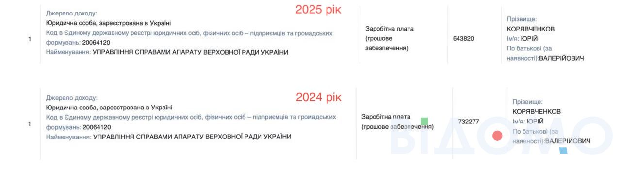 Так, у 2024 році заробітна плата народного депутата була 732 277 гривень, а у 2025 році стала лише 643 820 гривень, тож Корявченков заробив на 88 457 гривень менше.