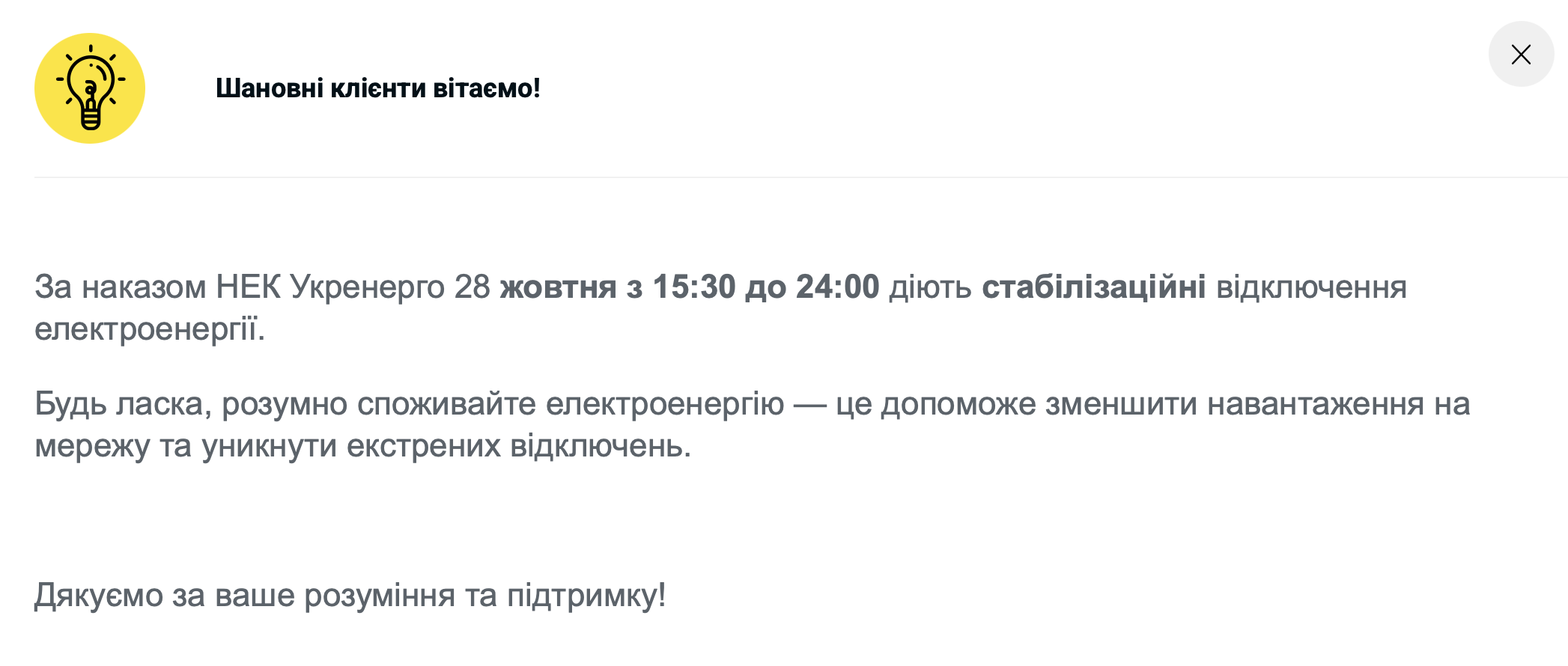 Зазначимо, що відключення електропостачання повʼязані з дефіцитом електроенергії в Україні та викликані постійними ворожими атаками на енергетичну інфраструктуру країни.