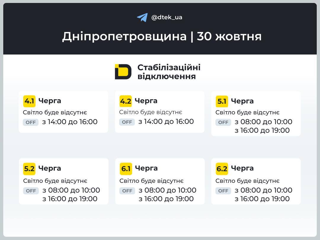 Станом на 30 жовтня, за наказом НЕК Укренерго, на Дніпропетровщині діють стабілізаційні відключення світла, передає "Відомо", з посиланням на ДТЕК — Дніпровські електромережі.