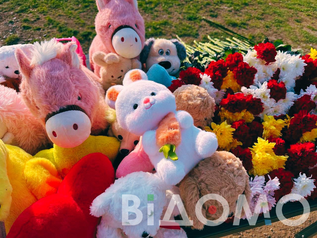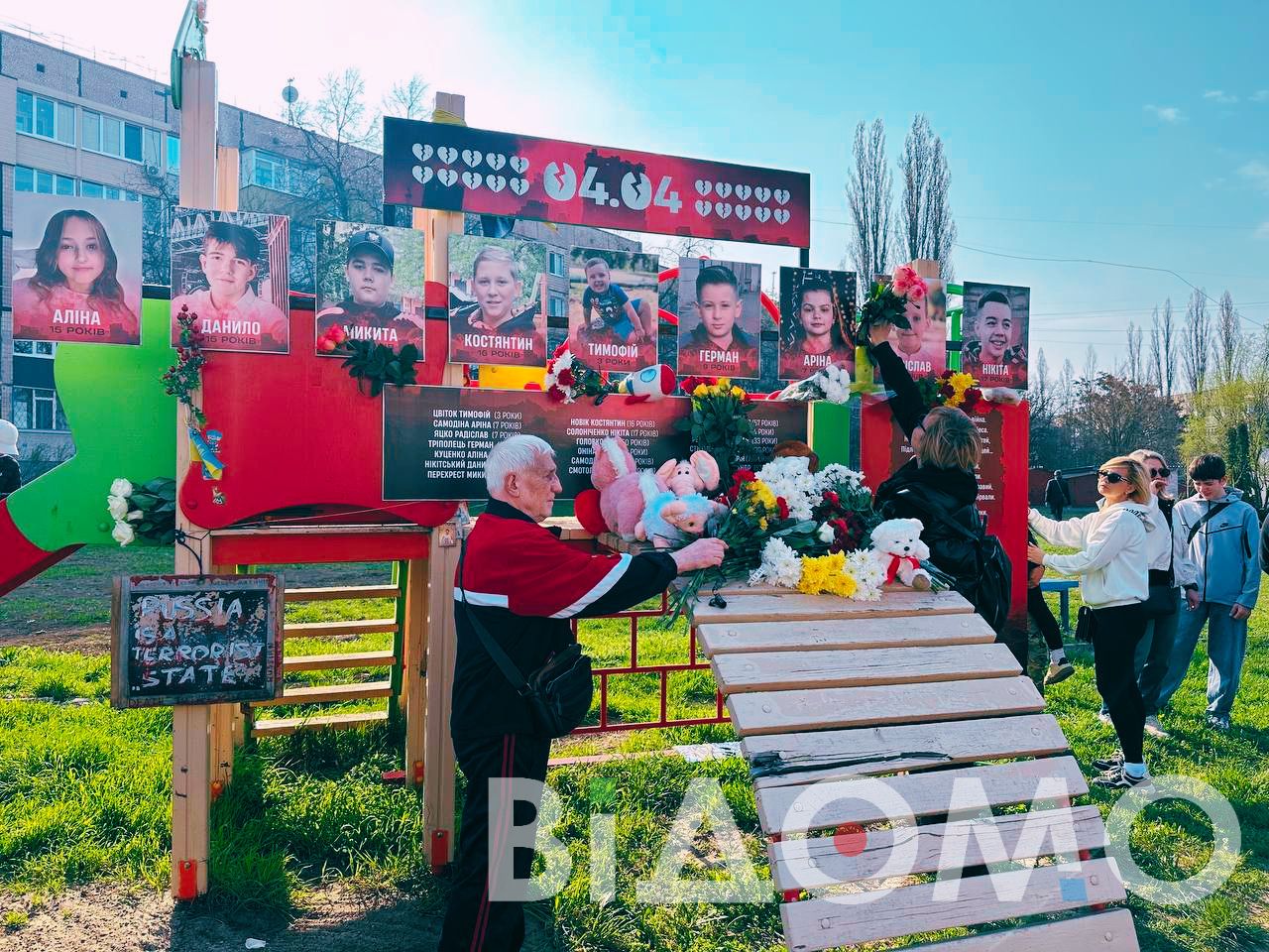 На дитячому майданчику знову море квітів та іграшок, але без дитячого сміху. Замість нього — вічна тиша та біль.